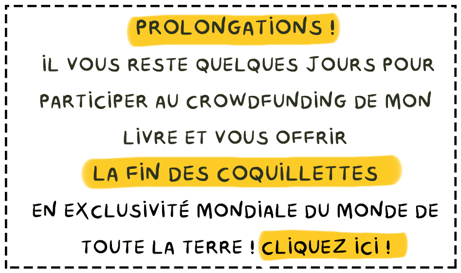 Je vous laisse réfléchir, moi j’y vais, faut que j’aille voir si vous avez commandé mon livre. QUOI ? Pas encore ?? Bon eh bien courrez, la campagne est prolongée jusqu’au 31 mars. (Et si vous placez le mot “potage tomate” en commentaire, je saurai que vous venez d’ici 👋.)